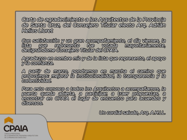 Compartimos con ustedes, la carta de agradecimiento del Arquitecto Adrián Helios Lloret, Consejero Titular electo por el claustro de Arquitectos.