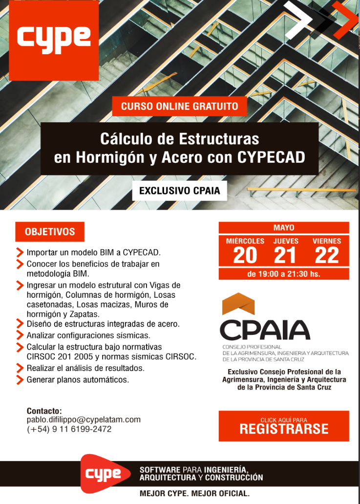 Cype, los desarrolladores del Software de calculo CypeCAD, han organizado un Curso Online gratuito de Cálculo de Estructuras en Hormigón y Acero. El mismo será exclusivo para matriculados CPAIA. Miércoles 20, Jueves 21 y Viernes 22 de mayo, de 19:00 a 21:30hs.